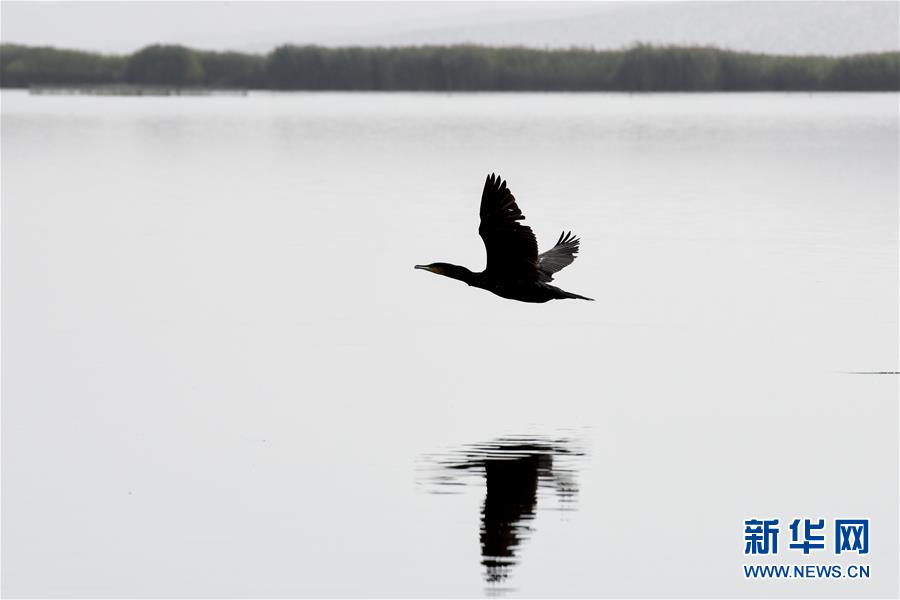 9月2日,一只水鸟掠过博斯腾湖湖面。新华社记者 丁磊 摄