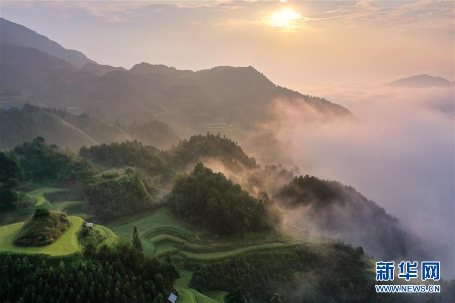 朝阳中被晨雾笼罩的加榜梯田(9月4日摄,无人机照片)。 秋日时节,位于贵州省黔东南苗族侗族自治州从江县的加榜梯田犹如一幅幅色彩斑斓的油画,吸引众多游客前来观光游览。 新华社记者 刘续 摄
