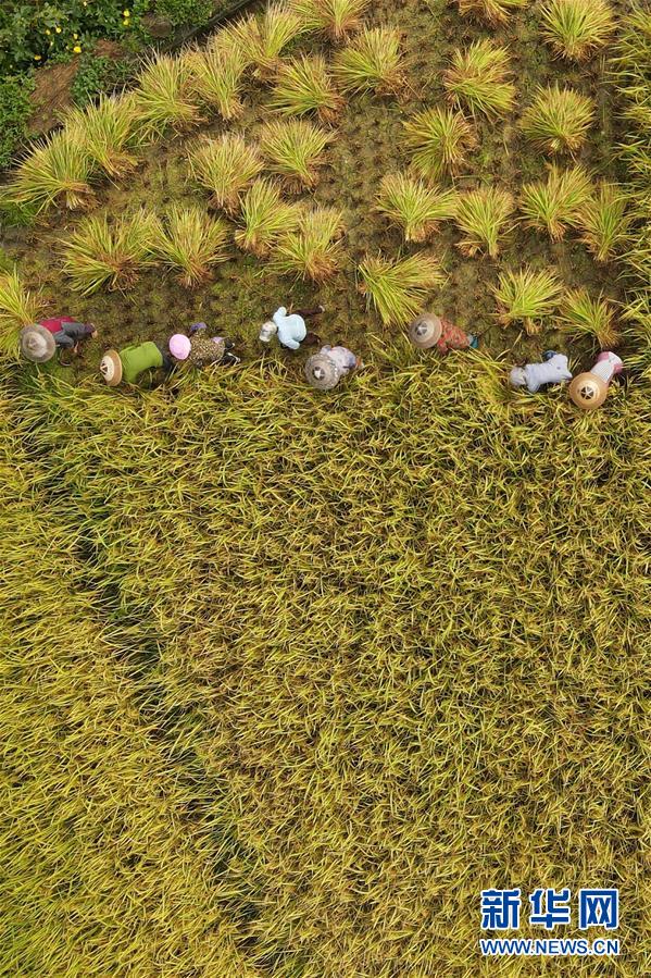 9月7日,在湖南省湘西土家族苗族自治州吉首市乾州街道西门口村,村民在田间收割稻谷(无人机照片)。 当日是白露节气,各地田间地头一片农忙景象。 新华社发(刘振军 摄)