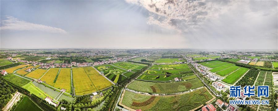 这是上海崇明区横沙乡丰乐村的稻田画(9月8日摄,无人机拼接照片)。 在上海崇明区横沙乡丰乐村,一片稻田画成为当地一道靓丽的风景。稻田中呈现出江豚和将于2021年在崇明举办的花博会主题元素图案,引人注目。 新华社记者 方喆 摄