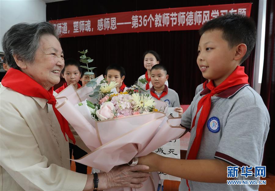 9月9日,在江苏省苏州市彩虹小学校,85岁高龄的老教师张慧仙与该校师生一起开展“忆师道·塑师魂·感师恩”的主题活动,孩子们为张慧仙送上鲜花。 教师节临近,各地人们以不同形式感念师恩,迎接即将到来的教师节。 新华社发(杭兴微 摄)