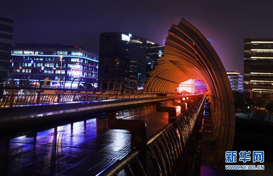 这是连接虹桥商务区和国家会展中心(上海)的人行天桥(9月10日摄)。 上海虹桥商务区位于虹桥交通枢纽和进博会举办地国家会展中心(上海)之间,地理位置十分优越,随着两届进博会的成功举办,上海虹桥商务区已经成为上海西部地区发展势头强劲的商业和购物休闲中心。入夜时分灯光辉映下的上海虹桥商务区尽显活力。 新华社记者 方喆 摄