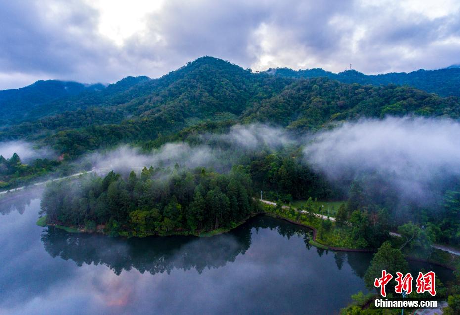 近日,记者走进位于海南尖峰岭国家级森林公园,来到海拔800米的高山盆地——尖峰岭天池,其周边是茂密的热带雨林,18座绿浪接天的千米奇峰环抱,约600亩高山湖碧波荡漾。每日清晨或傍晚,天池水面泛起层层薄雾,宛若仙境。图为航拍清晨泛起层层云雾的海南尖峰岭天池。 骆云飞 摄