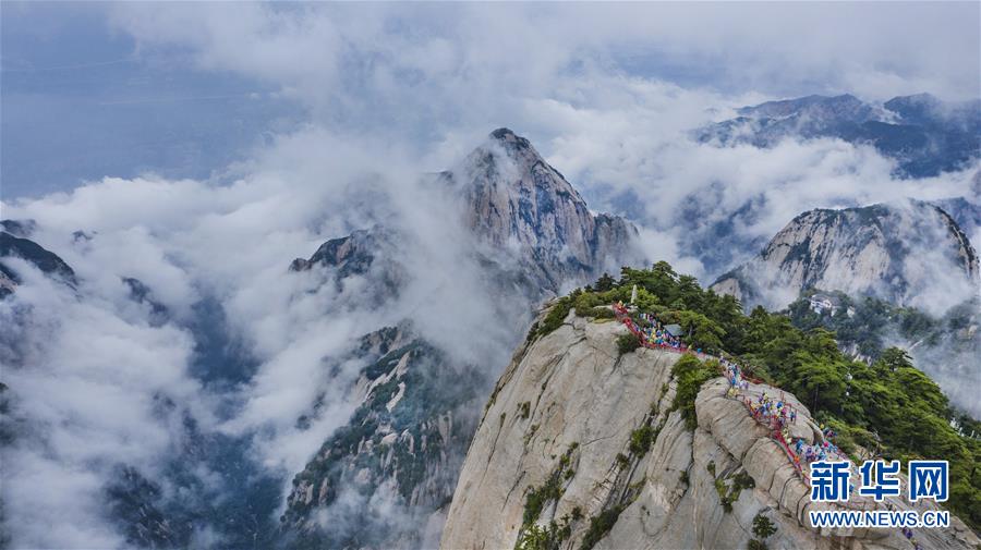 9月20日,穿着雨衣的游客在攀登华山西峰青龙背(无人机照片)。 秋雨中的西岳华山,云雾缭绕,山峰若隐若现,宛若仙境。 新华社记者陶明摄