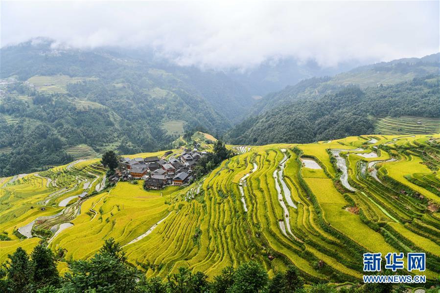 这是从江县加榜梯田待收割的稻谷(9月19日摄)。 近日,位于月亮山区的贵州省从江县加榜梯田种植的水稻迎来收获季节,当地农民抓住秋雨停歇时机收割、搬运、晾晒稻谷。 新华社记者 杨文斌 摄