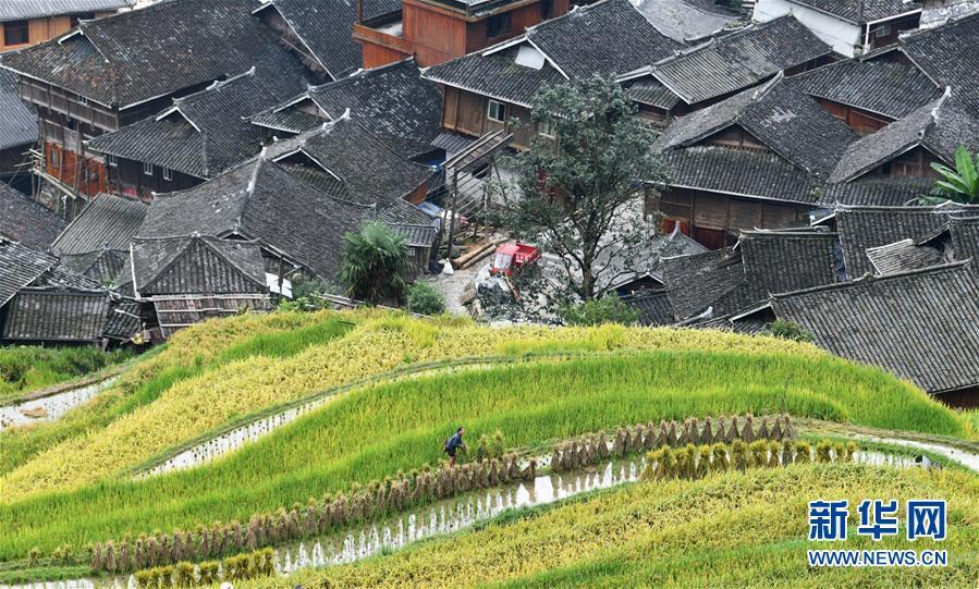9月19日,从江县加榜乡加车村的农民在收割稻谷。 近日,位于月亮山区的贵州省从江县加榜梯田种植的水稻迎来收获季节,当地农民抓住秋雨停歇时机收割、搬运、晾晒稻谷。 新华社记者 杨文斌 摄