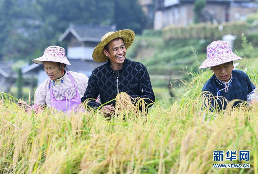 9月19日,从江县加榜乡加车村的农民在收割稻谷。 近日,位于月亮山区的贵州省从江县加榜梯田种植的水稻迎来收获季节,当地农民抓住秋雨停歇时机收割、搬运、晾晒稻谷。 新华社记者 杨文斌 摄