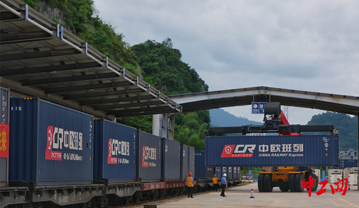 9月23日,中越集装箱跨境班列在广西凭祥铁路口岸物流中心装车。(摄影:杨宝森)