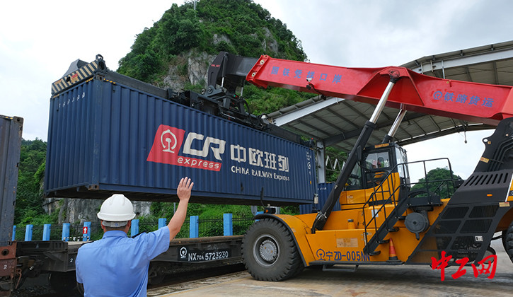 9月23日,中越集装箱跨境班列在广西凭祥铁路口岸物流中心装车。(摄影:杨宝森)