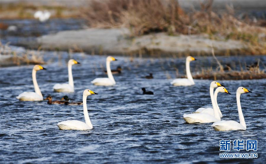 9月23日,几只白天鹅在乌伦古湖国家湿地公园觅食。 乌伦古湖国家湿地公园位于新疆阿勒泰地区福海县,是迁徙候鸟飞越天山和阿尔泰山的“能量补充站”。金秋时节,迁徙的候鸟会在此停留,成为湿地一道靓丽风景。近年来,随着阿勒泰地区生态环境不断改善,乌伦古湖湿地公园各类候鸟数量不断增加。 新华社记者 沙达提 摄