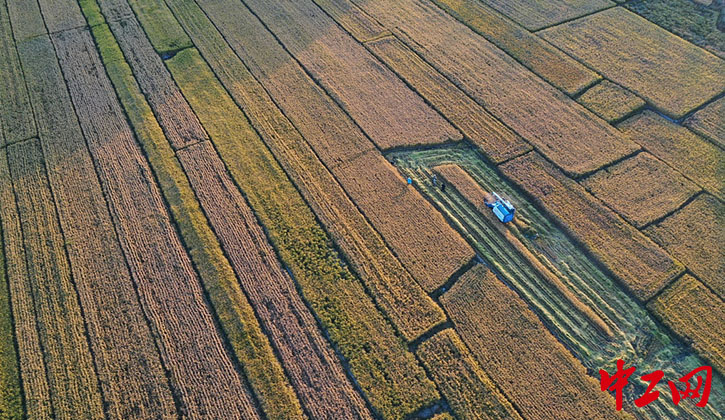 2020年10月2日,一台小型收割机在新疆博乐市小营盘镇塔翁哈木村村民简江胜家水稻地里收割。(胡维斌/视觉中国)