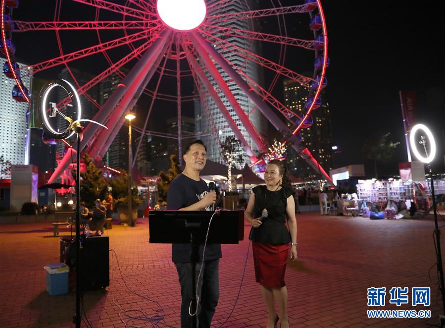 10月3日,在香港维港边的摩天轮下,两名演唱者在直播。 国庆假期期间,香港维港夜色缤纷,歌声不断。 新华社记者 吴晓初 摄