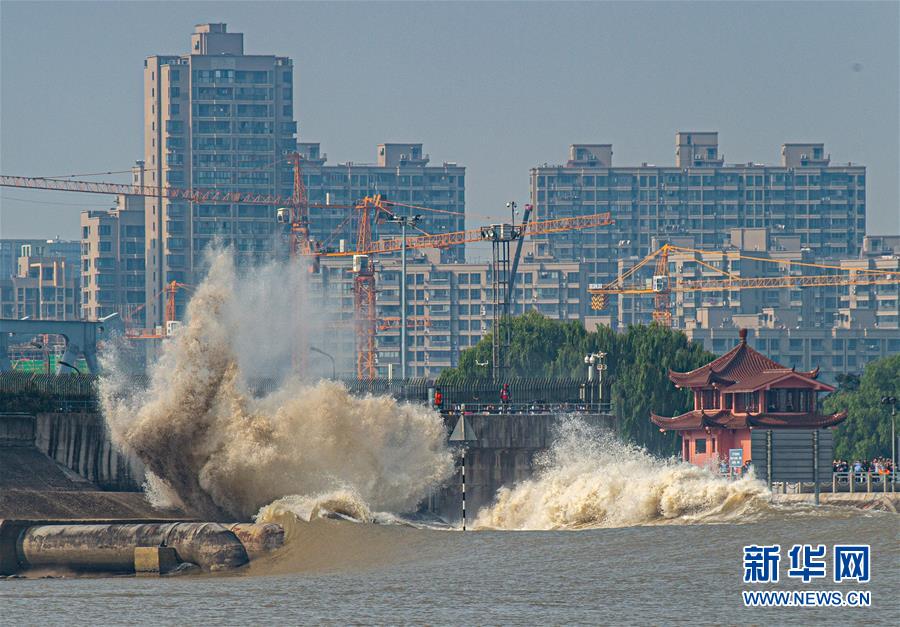 10月3日,钱塘江潮水冲击杭州三堡船闸堤坝形成巨浪。 钱塘江大潮自古闻名,2020年钱塘江大潮的最佳观潮期恰好与国庆、中秋假期重叠。 新华社发(江汉摄)