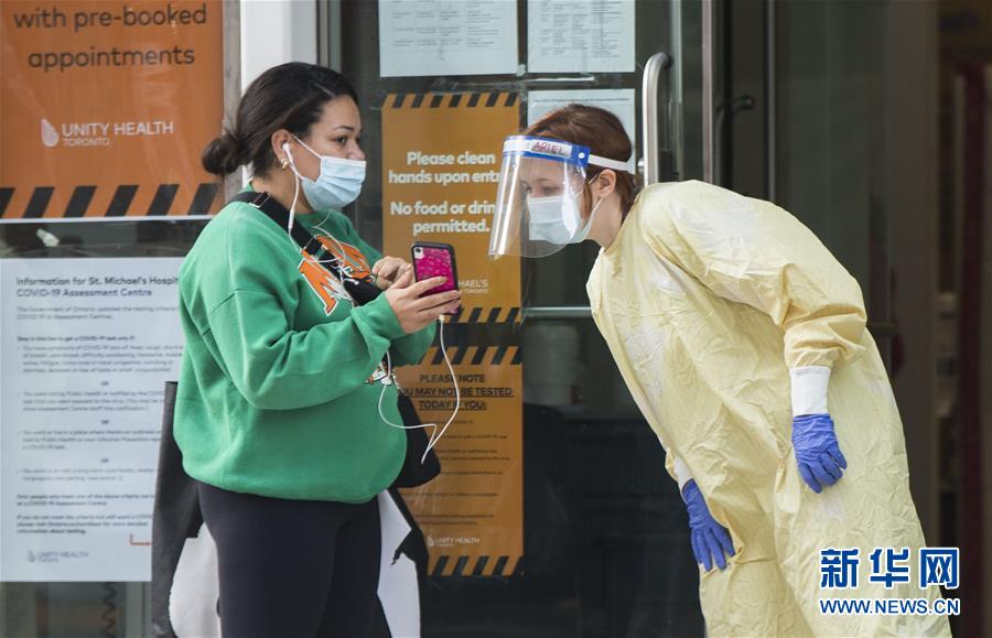 10月6日,在加拿大多伦多一处新冠病毒检测中心,医护人员查看检测者的预约信息。 截至当日下午,加拿大累计新冠确诊病例上升至170945例,累计死亡病例9527例。 新华社发(邹峥摄)