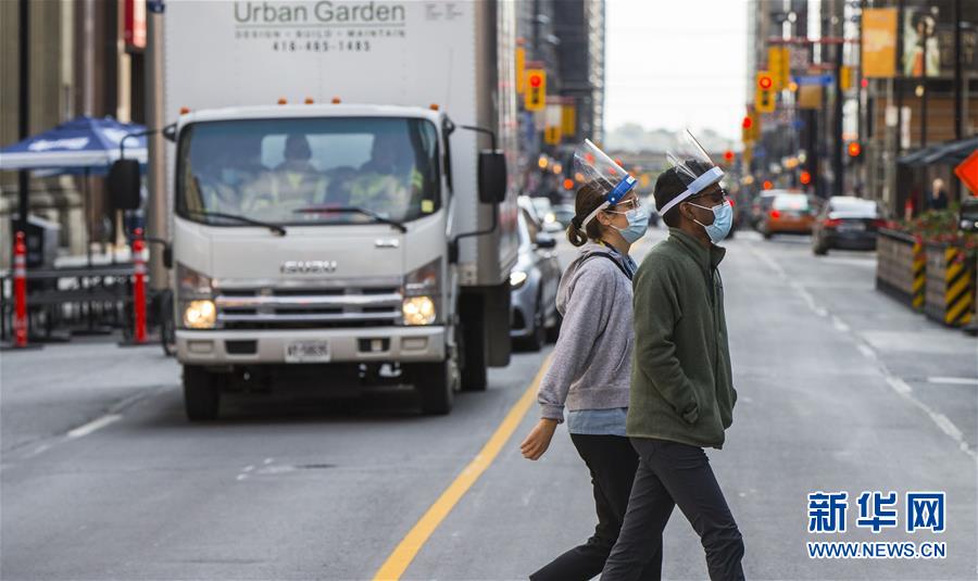 10月6日,在加拿大多伦多,两名戴口罩的行人穿过马路。 截至当日下午,加拿大累计新冠确诊病例上升至170945例,累计死亡病例9527例。 新华社发(邹峥摄)