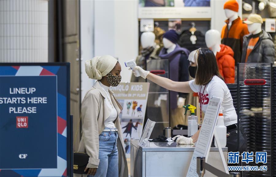 10月6日,在加拿大多伦多伊顿购物中心,一名商店店员为进店顾客测量体温。 截至当日下午,加拿大累计新冠确诊病例上升至170945例,累计死亡病例9527例。 新华社发(邹峥摄)