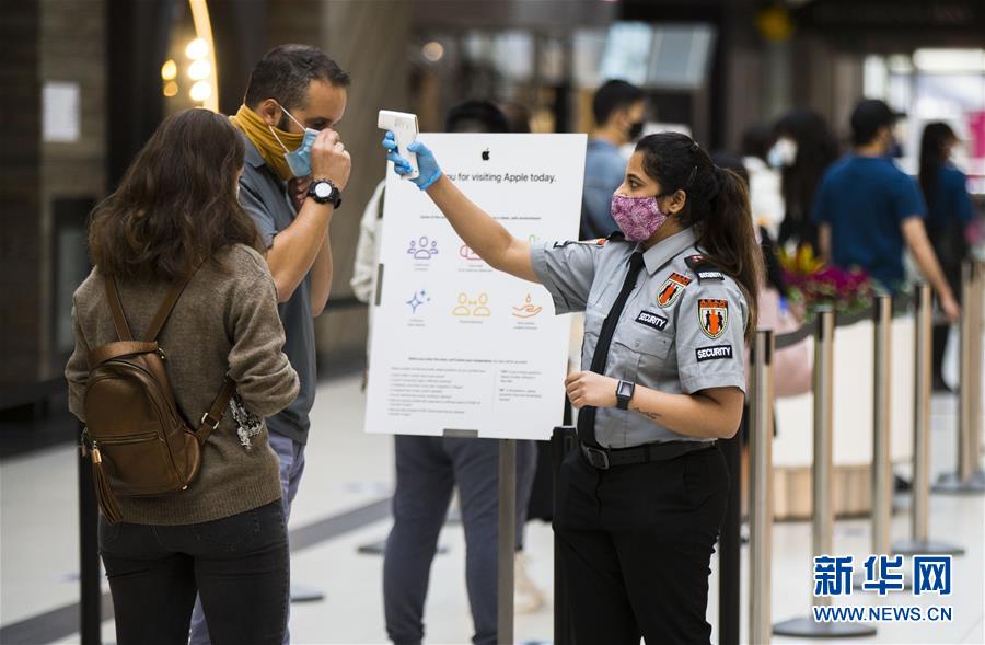 10月6日,在加拿大多伦多,一名苹果商店的安保人员为进店顾客测量体温。 截至当日下午,加拿大累计新冠确诊病例上升至170945例,累计死亡病例9527例。 新华社发(邹峥摄)
