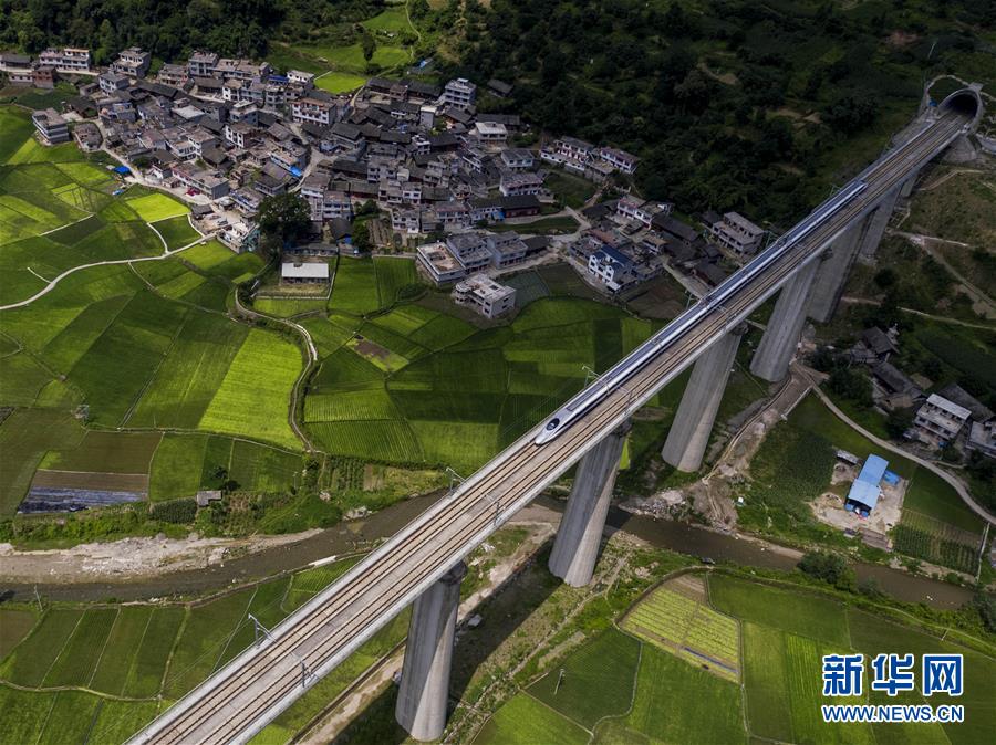 一列动车组列车行驶在凯里境内(2016年6月22日拍摄的无人机照片)。 西江千户苗寨、郎德苗寨位于贵州省黔东南苗族侗族自治州雷山县,距离沪昆高铁凯里南站均不到50公里的路程。近年来,当地不断推动高铁资源和旅游景区深度融合,方便各地游客前来体验苗族风情,观赏苗寨美景,为古老苗寨的乡村振兴注入活力。 新华社发(吴吉斌 摄)