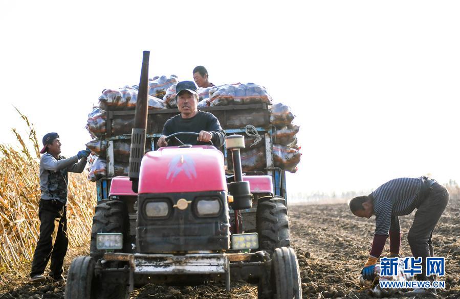 10月10日,在松原扶余市三岔河镇西大七号村,农民在装运土豆。 金秋十月,位于吉林省重要粮食产区的松原迎来收获季,当地农民抢抓农时收获玉米、土豆等作物,田间地头一片繁忙景象。 新华社发(颜麟蕴摄)