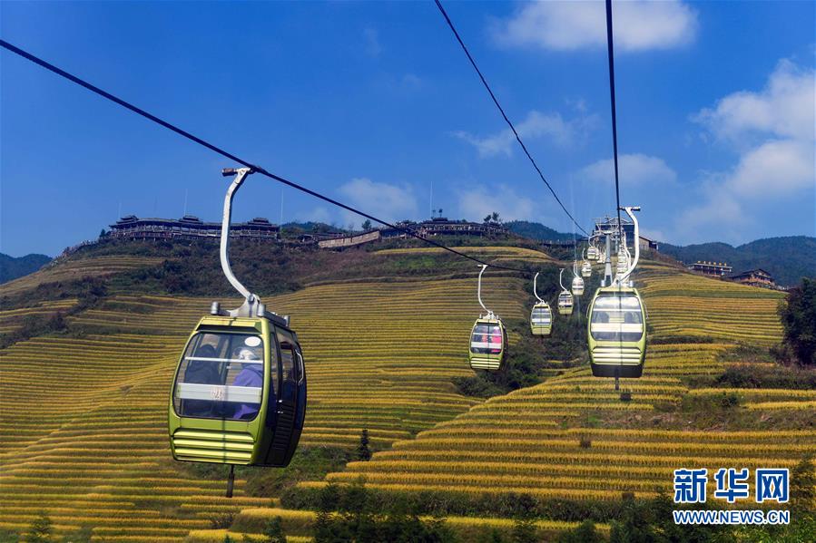 10月12日,在广西龙胜各族自治县龙脊梯田景区,游客乘坐缆车观赏梯田美景。 金秋时节,广西龙胜各族自治县龙脊梯田景区层层梯田尽染金黄,稻谷飘香,梯田与吊脚楼、村庄、远山相映成趣,美不胜收。 新华社发(吴生斌 摄)