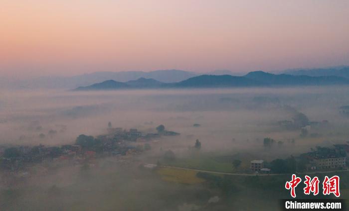 云雾缭绕的村庄与云海、日出勾勒出一幅美丽的日出画卷,美不胜收。 魏东升 摄