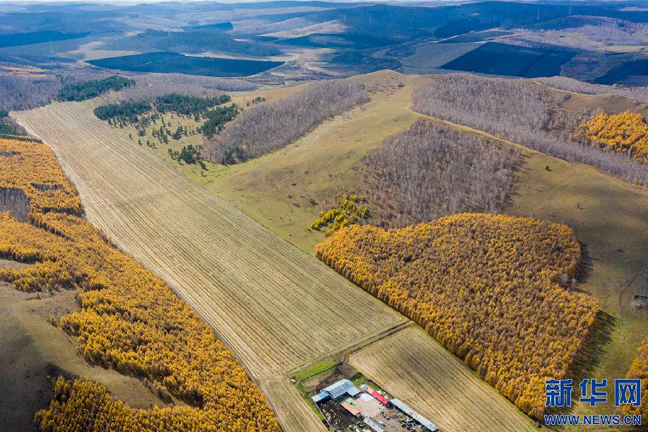 深秋时节,内蒙古大兴安岭上的兴安落叶松绽放出金黄的颜色,在阳光下绚烂夺目,和周边田野交相辉映。新华网发(李明 摄)