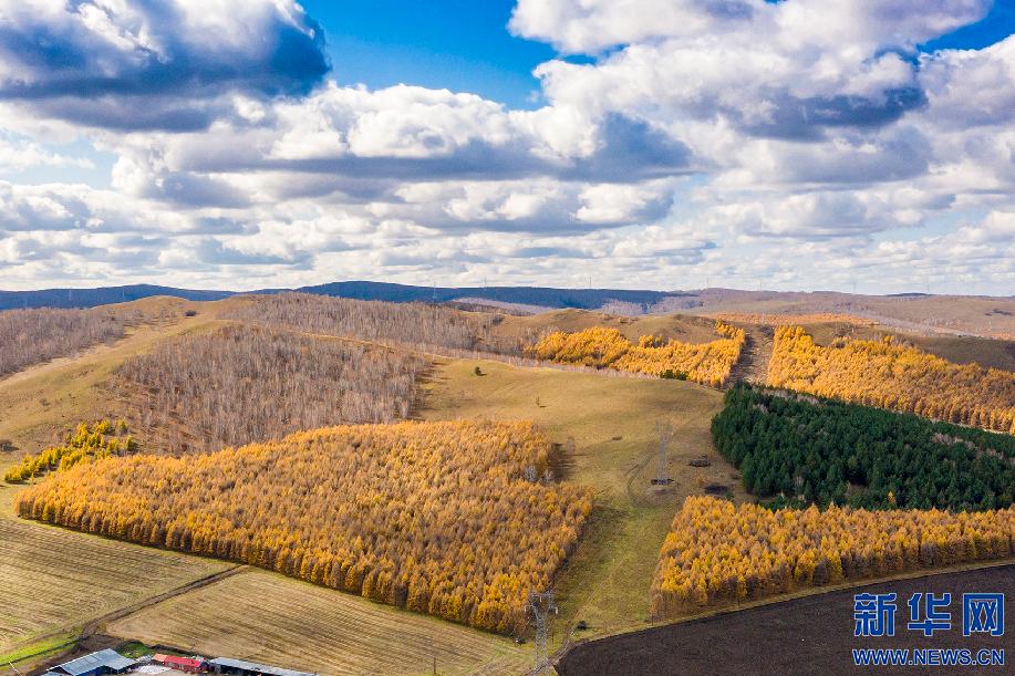 深秋时节,大兴安岭上的兴安落叶松绽放出金黄的颜色,在阳光下绚烂夺目,和周边田野交相辉映。新华网发(李明 摄)