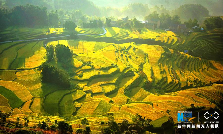 秋日阳光下,错落有致的梯田与村庄交融,构成一幅田园画卷。新华网发(陈碧生 摄)