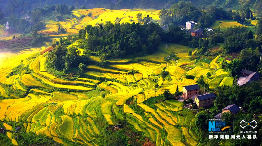 这是无人机视角下的花田乡梯田,千亩梯田黄,秋色美如画。新华网发(陈碧生 摄)