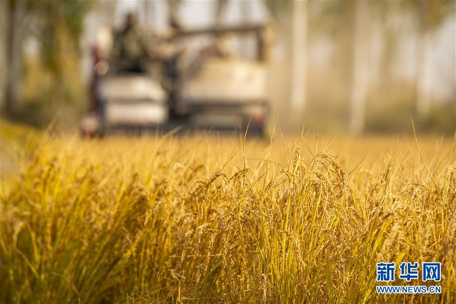 10月16日,收割机在新疆阿克苏地区温宿县托乎拉乡托万克苏布拉克村田间收割水稻。 阿克苏地区温宿县地处天山南麓,是新疆水稻主产区之一。金秋时节,温宿县11.8万多亩水稻陆续进入成熟期,乡间田野一片金黄,美不胜收。当地农户抢抓农时,收割水稻,大米加工企业有序开展收购和生产工作。 新华社记者 胡虎虎 摄