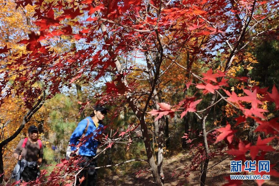 10月18日,游客在磬锤峰国家森林公园游玩。 金秋时节,河北承德磬锤峰国家森林公园的枫叶进入观赏佳期,吸引游客前来观赏游玩。 新华社发(刘环宇 摄)