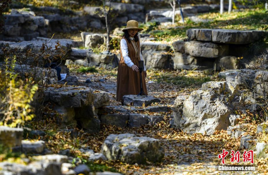 10月20日,新疆乌鲁木齐市人民公园秋色正浓,一位市民在落满黄叶的公园内支起手机录制视频。中新社记者 刘新 摄