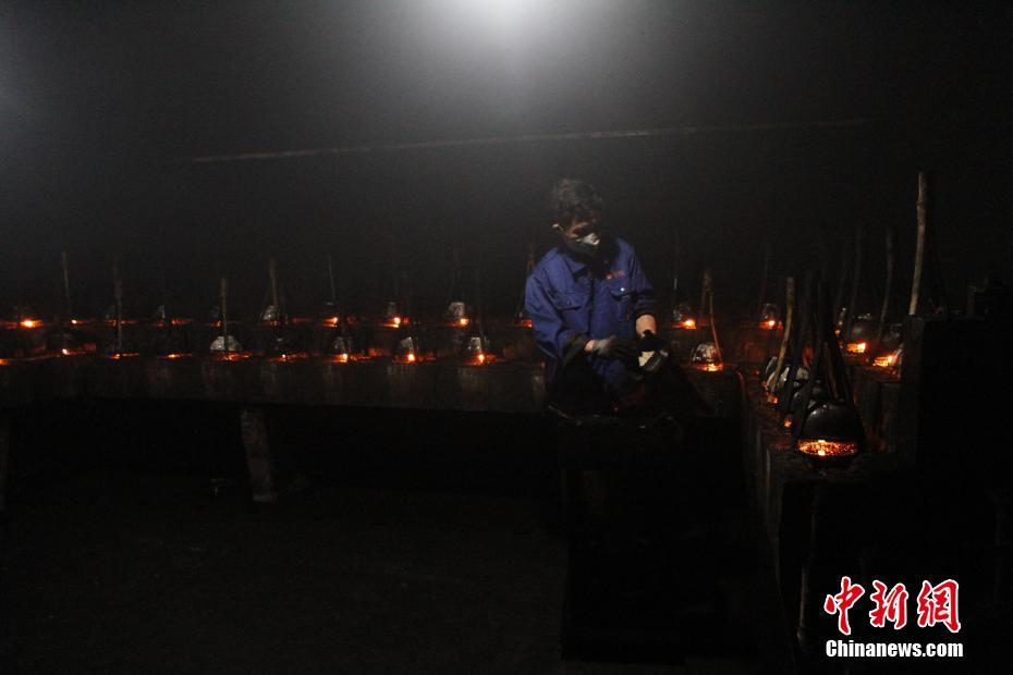 徽墨的历史有1200多年,因产于古徽州府而得名,因其“坚如玉、研无声、一点如漆、万载存真”等特点为文人墨客所钟爱。2006年,徽墨制作技艺被列入首批中国国家级非物质文化遗产名录。炼烟、和料、制墨、描金……13道制墨工序看似简单,实则各有讲究,整个成品制作下来,着实不易。图为10月15日,安徽省歙县老胡开文墨厂,一名工人在取烟。中新社记者 刁海洋 摄