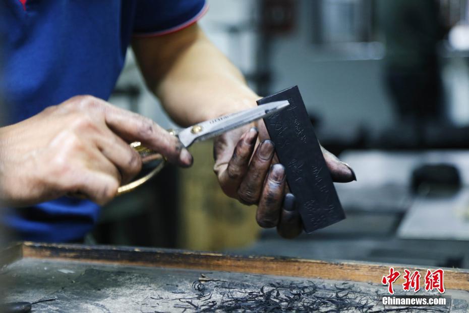 图为10月15日,在安徽歙县老胡开文墨厂,一位工人正在对毛坯墨边缘进行修剪。中新社记者 马铭言 摄