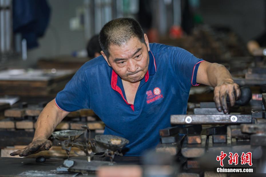图为10月15日,安徽省歙县老胡开文墨厂的车间内,一位工人正在制作墨块。中新社记者 刘力鑫 摄