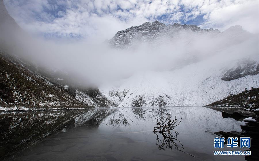 这是10月21日在玛嘉沟拍摄的云雾缭绕的月亮湖。新华社记者 江宏景 摄