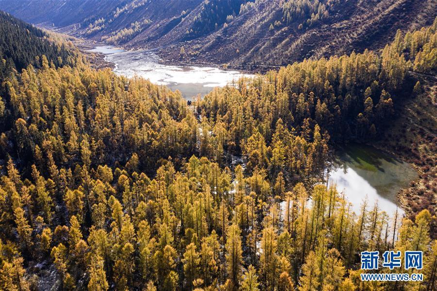这是10月21日在玛嘉沟拍摄的彩林和湖泊(无人机照片)。 新华社记者 江宏景 摄