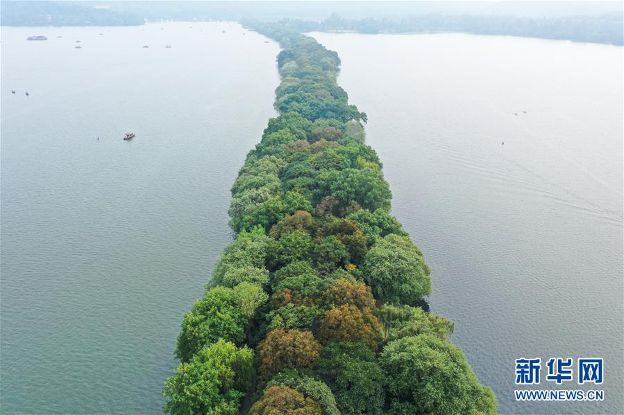 10月22日,西湖苏堤植被染上秋色(无人机照片)。 近日,随着气温降低,杭州西湖初露秋色,显出迷人风韵。 新华社记者 翁忻旸 摄