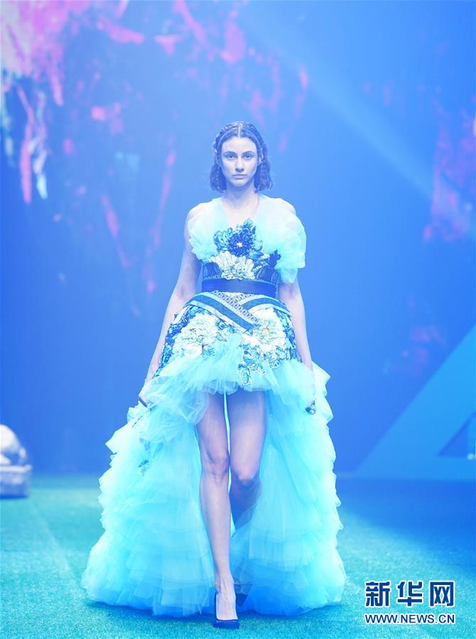 10月25日,模特在天才妈妈×东乡绣娘·张肇达公益时装秀上展示。 当日,“天才妈妈×东乡绣娘”公益品牌计划发布会暨天才妈妈×东乡绣娘·张肇达公益时装秀在北京举办。时装秀上,60套富有东乡族刺绣设计元素的时装为观众们献上一场视觉盛宴。 新华社记者 陈建力 摄