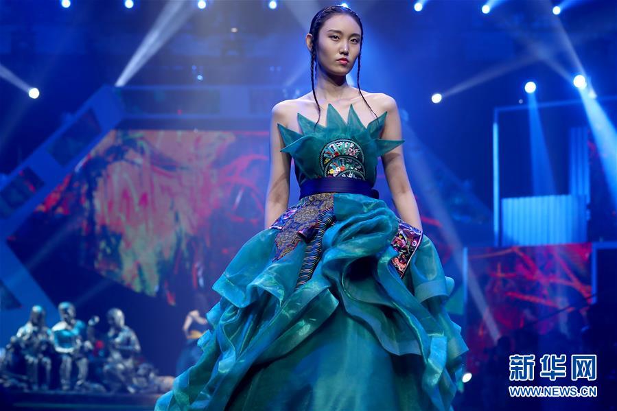 10月25日,模特在天才妈妈×东乡绣娘·张肇达公益时装秀上展示。 当日,“天才妈妈×东乡绣娘”公益品牌计划发布会暨天才妈妈×东乡绣娘·张肇达公益时装秀在北京举办。时装秀上,60套富有东乡族刺绣设计元素的时装为观众们献上一场视觉盛宴。 新华社记者 张玉薇 摄