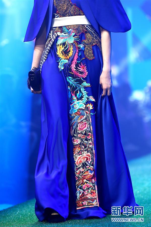 10月25日,模特在天才妈妈×东乡绣娘·张肇达公益时装秀上展示。 当日,“天才妈妈×东乡绣娘”公益品牌计划发布会暨天才妈妈×东乡绣娘·张肇达公益时装秀在北京举办。时装秀上,60套富有东乡族刺绣设计元素的时装为观众们献上一场视觉盛宴。 新华社记者 张玉薇 摄