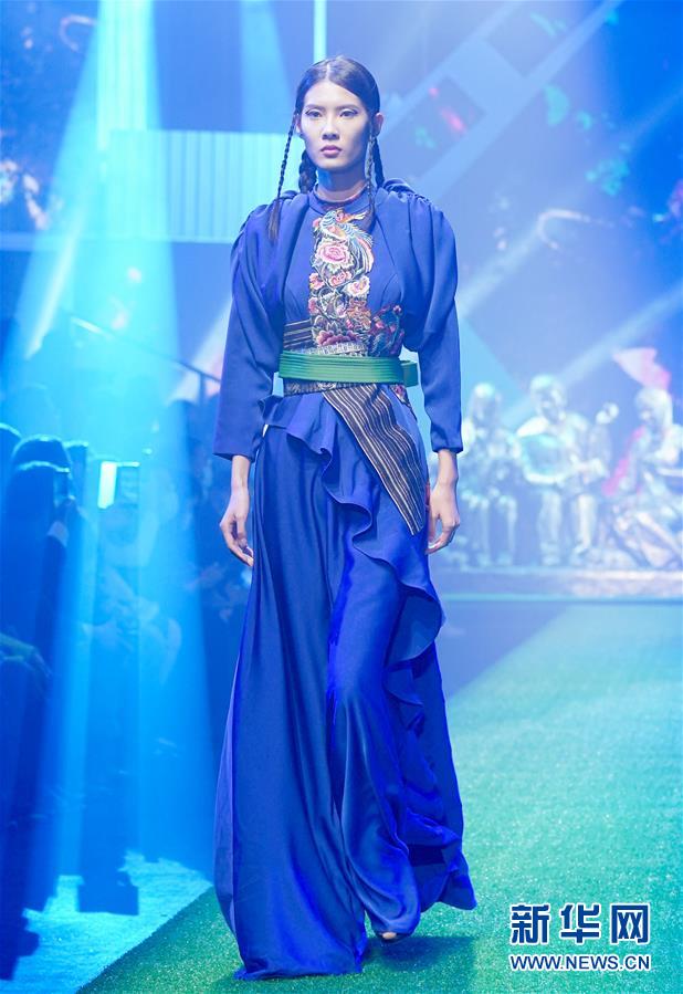 10月25日,模特在天才妈妈×东乡绣娘·张肇达公益时装秀上展示。 当日,“天才妈妈×东乡绣娘”公益品牌计划发布会暨天才妈妈×东乡绣娘·张肇达公益时装秀在北京举办。时装秀上,60套富有东乡族刺绣设计元素的时装为观众们献上一场视觉盛宴。 新华社记者 陈建力 摄