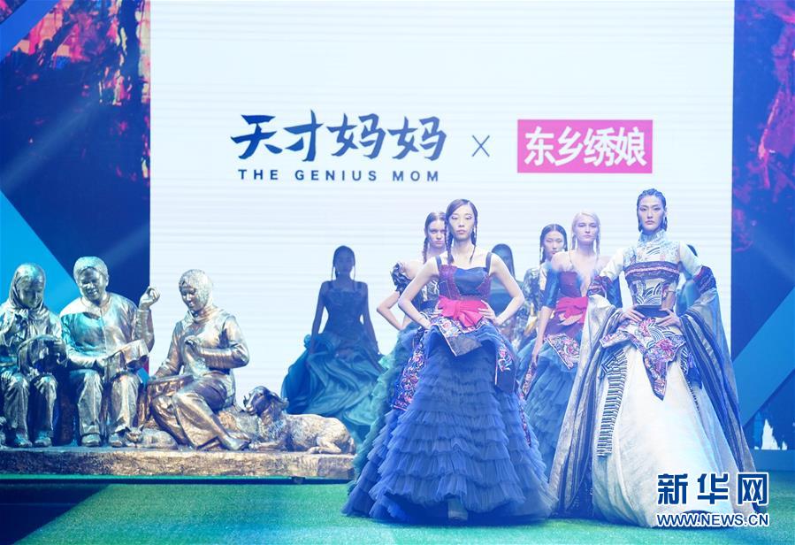 10月25日,模特在天才妈妈×东乡绣娘·张肇达公益时装秀上展示。 当日,“天才妈妈×东乡绣娘”公益品牌计划发布会暨天才妈妈×东乡绣娘·张肇达公益时装秀在北京举办。时装秀上,60套富有东乡族刺绣设计元素的时装为观众们献上一场视觉盛宴。 新华社记者 陈建力 摄