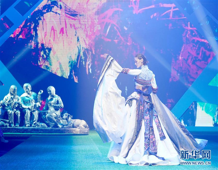 10月25日,模特在天才妈妈×东乡绣娘·张肇达公益时装秀上展示。 当日,“天才妈妈×东乡绣娘”公益品牌计划发布会暨天才妈妈×东乡绣娘·张肇达公益时装秀在北京举办。时装秀上,60套富有东乡族刺绣设计元素的时装为观众们献上一场视觉盛宴。 新华社记者 陈建力 摄