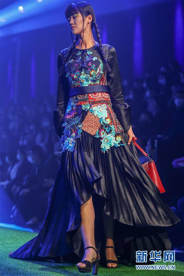 10月25日,模特在天才妈妈×东乡绣娘·张肇达公益时装秀上展示。 当日,“天才妈妈×东乡绣娘”公益品牌计划发布会暨天才妈妈×东乡绣娘·张肇达公益时装秀在北京举办。时装秀上,60套富有东乡族刺绣设计元素的时装为观众们献上一场视觉盛宴。 新华社记者 张玉薇 摄