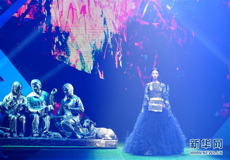 10月25日,模特在天才妈妈×东乡绣娘·张肇达公益时装秀上展示。 当日,“天才妈妈×东乡绣娘”公益品牌计划发布会暨天才妈妈×东乡绣娘·张肇达公益时装秀在北京举办。时装秀上,60套富有东乡族刺绣设计元素的时装为观众们献上一场视觉盛宴。 新华社记者 陈建力 摄