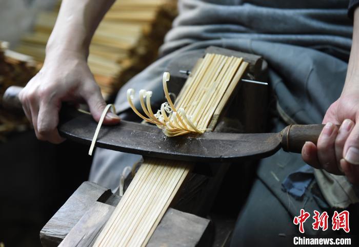 图为重庆市非遗传承人李开军正在为制作荣昌折扇削大边。 周毅 摄