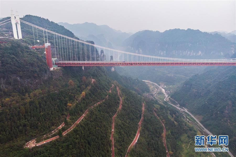 这是10月28日在湖南省吉首市矮寨镇拍摄的盘山公路,远处是矮寨大桥(无人机照片)。新华社记者 陈思汗 摄