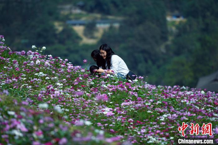 10月28日,游客在广西龙胜各族自治县泗水乡周家村布尼花海梯田赏花游玩。 吴生斌 摄