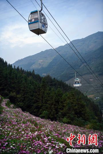 10月28日,在广西龙胜各族自治县泗水乡周家村布尼花海梯田,游客乘坐缆车观花。 吴生斌 摄